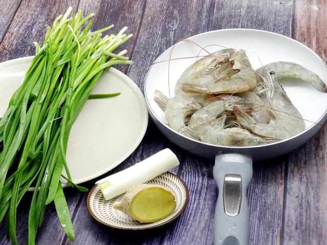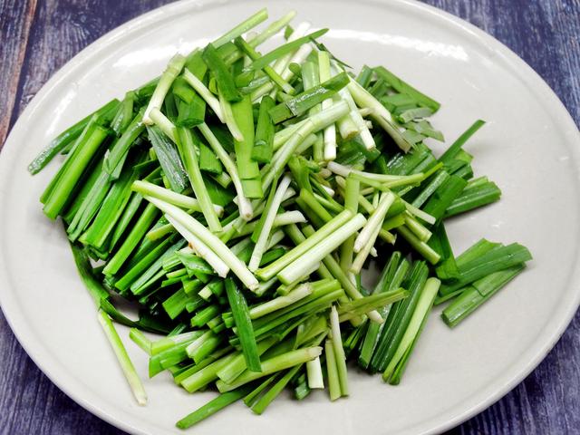 1.韭菜择洗干净,可以先用食用碱浸泡一会,有效地去除农药残留。韭菜洗净后沥干水分,切成4厘米长的段,葱取葱白切丝,生姜去皮切丝。