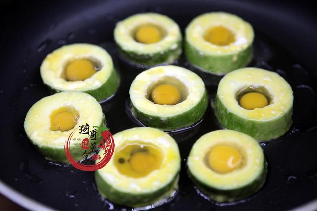 4.取平底煎锅,加入少许食用油,把西葫芦圈码入锅中,把鹌鹑蛋打入其中,一个西葫芦圈打一个鹌鹑蛋。