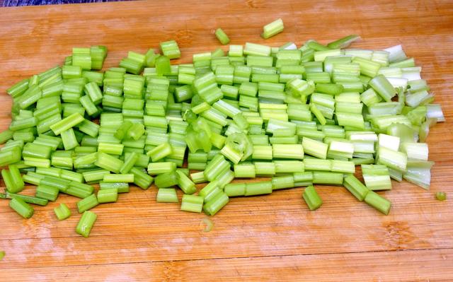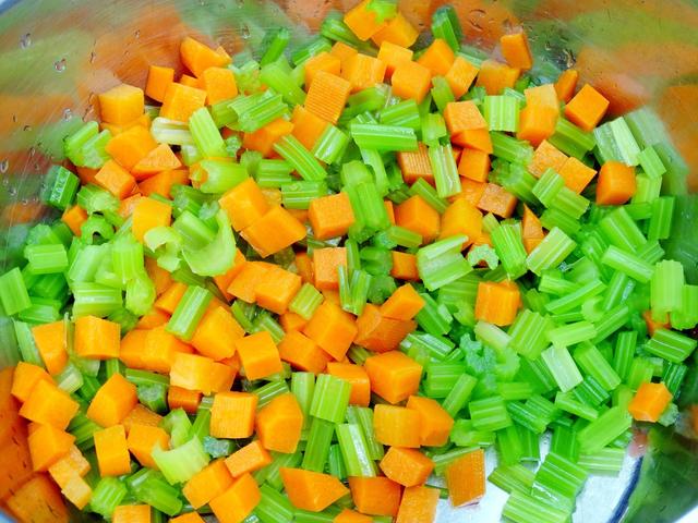 1.芹菜择洗干净,去掉叶子,留作它用。粗的芹菜梗从中间破开,切成1.5厘米的丁;胡萝卜洗净去皮,也切成1.5厘米的丁备用,葱白和生姜切末。
