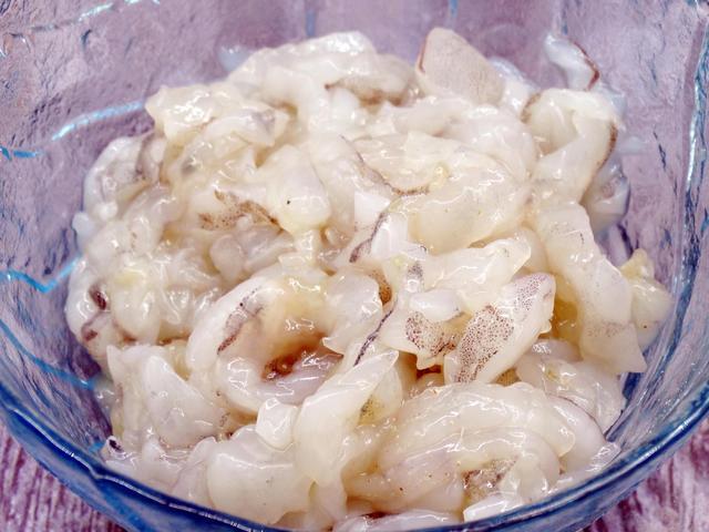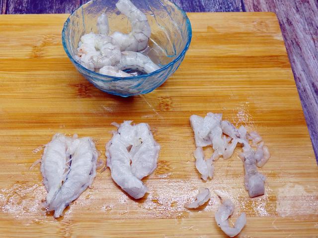 2.最好购买鲜活的青虾,没有的话冰冻的也可,洗净后去头去壳和虾线,从虾的背部片一刀,深度三分之二,然后把虾肉铺在案板上,用刀面拍一下,扩大虾肉的面积,切成虾肉丝。