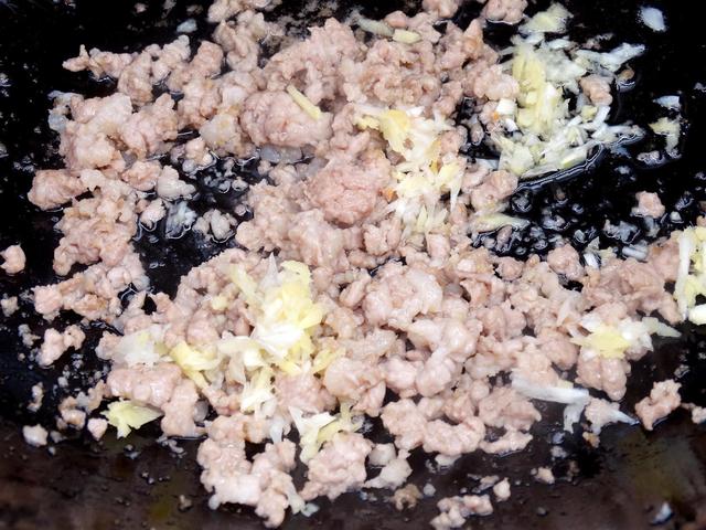3.起锅点火,加入少许食用油,热锅凉油状态下入猪肉末煸炒,煸炒出猪油后,下葱姜末炒香。