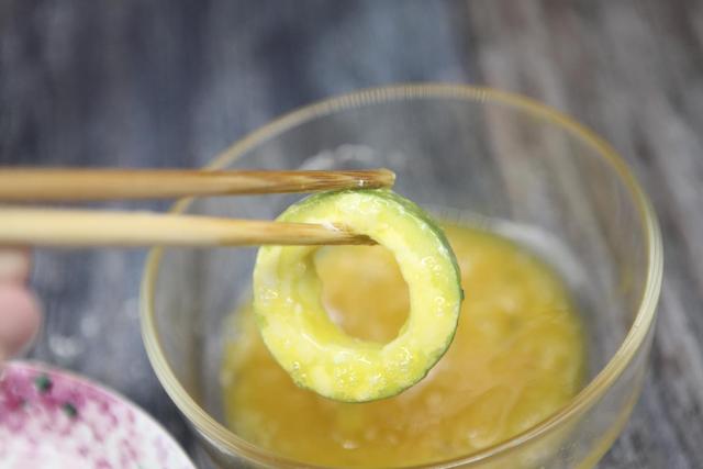 3.鸡蛋打入碗中,加入少许食盐搅匀,把西葫芦圈拖上蛋液放盘中备用。