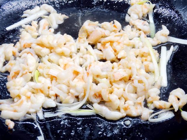 4.起锅烧油,下入葱姜炒香,下入虾肉丝煸炒变色,烹入料酒,加入小半勺清水,食盐,生抽,胡椒粉调味。