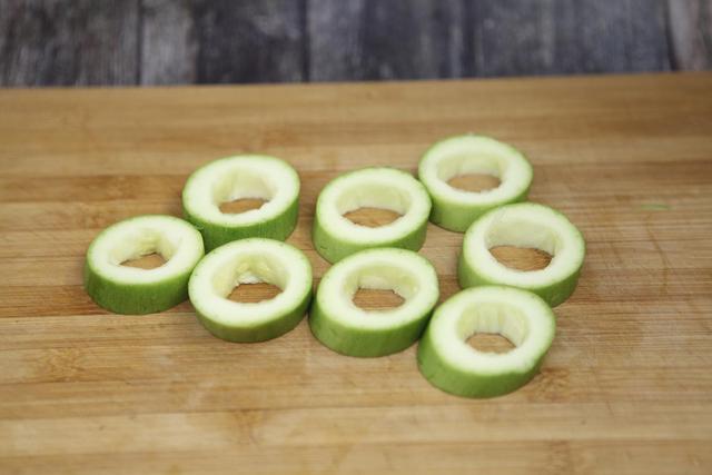 1.挑一个不太粗的西葫芦,洗净沥干水分,注意不要去皮。顶刀切成1厘米厚的片,用勺子挖出西葫芦籽备用。