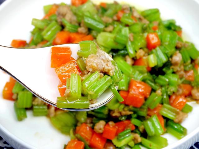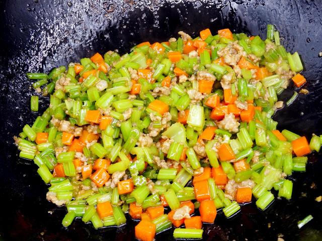 4.烹入料酒后,下入芹菜胡萝卜丁翻炒,加食盐,生抽,白糖,鸡精翻炒2-3分钟,加水淀粉勾芡出锅即好。