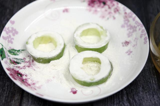 2.取一个容器装少许面粉,把西葫芦圆形圈两面都沾满一层面粉备用。