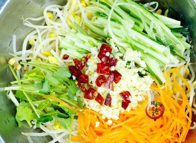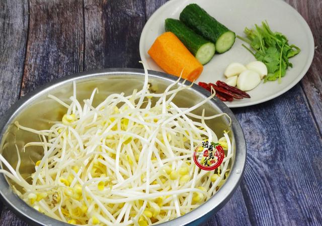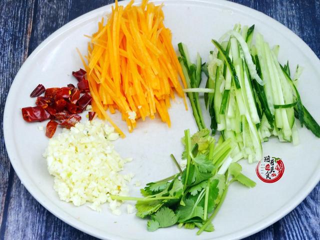 所需食材:黄豆芽,胡萝卜,黄瓜,香菜,大蒜,干红辣椒