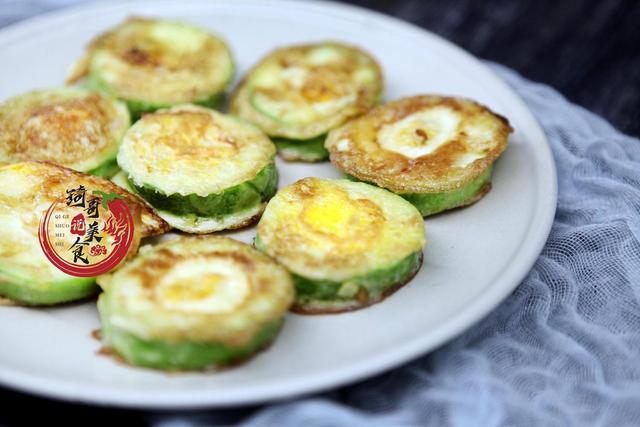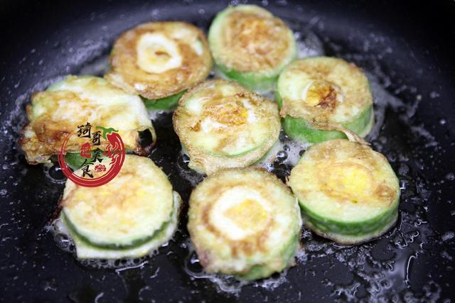 5.开小火煎制,等到西葫芦圈底面的蛋液凝固,翻面煎制另一面,待两面金黄色,即可出锅食用。