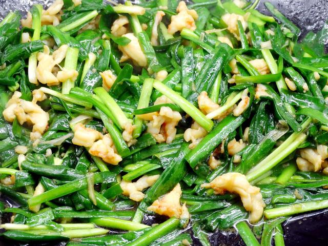 5.等汤汁沸腾收浓后,下入韭菜段翻炒几十秒,看韭菜打蔫,淋香油出锅即可。