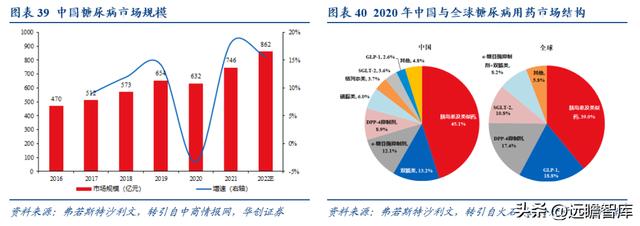中国的糖尿病患者人数居全球之首,2021年中国糖尿病患者约1.4亿人,由于生活方式变化以及人口老龄化,中国的糖尿病患者数量还将持续增加。庞大的患者群体催生巨大的用药需求,2021年中国的糖尿病药物市场规模为746亿元(+18%),预计2022年将达到862亿元。随着患者支付能力的增加和糖尿病创新药物的不断发展,中国糖尿病市场依然将保持高速增长。
