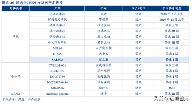 信立泰的抗PCSK9单克隆抗体注射液(SAL003)于2019年12月获得临床批准,拟开发适应症为高胆固醇血症和混合型血脂异常,目前正处于I期临床阶段。