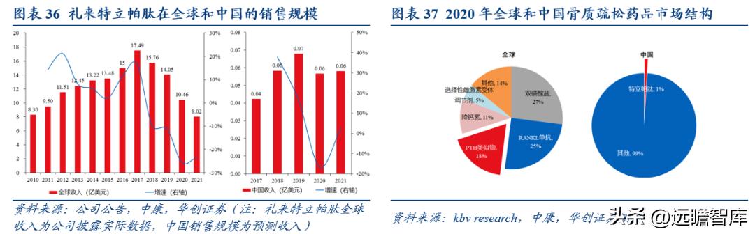 特立帕肽原研为礼来,2002年在美国上市,2011年在中国获批。礼来的特立帕肽全球年销售峰值17亿美元,而在中国获批的十年以来,特立帕肽始终没有放量,2021年收入仅0.06亿美元。从市场结构来看,2020年全球PTH类似物(包括特立帕肽、阿巴洛肽等)占比达到18%,而在中国特立帕肽市占率仅1%。