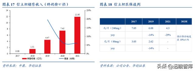 2017年信立坦通过谈判顺利进入医保目录,并在2019年和2021年完成续约,降价幅度分别为14%和29%,目前240mg规格价格为4.3元/片。医保准入后信立坦放量迅速,根据中康数据估算,2021年信立坦医院端和零售端销售收入合计12亿元,同比增长60%。