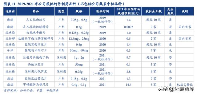同时,除已进入集采的品种外,公司延续难仿、高端的布局思路,打造优质仿制药产品梯队。2019-2021年公司左乙拉西坦缓释片、头孢呋辛酯片、盐酸帕罗西汀肠溶缓释片等品种先后获批,进一步丰富了公司仿制药产品管线。