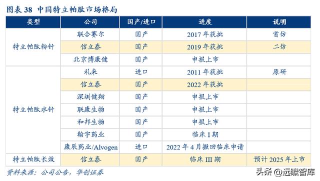 信立泰特立帕肽粉针在2019年获批,为国产第二家。水针于2022年4月获得NMPA批准,是首个国产特立帕肽水针。国内深圳健翔、联康生物、和邦生物的水针已经报产,未来几年将看到3款以上国产水针获批。