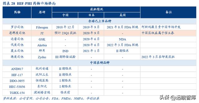 全球首个上市的HIF-PHI药物为Fibrogen的罗沙司他。2018年12月,罗沙司他在中国获批上市,用于慢性肾病透析患者的贫血治疗。罗沙司他部分化合物在2024年到期,晶型专利2033年到期。罗沙司他每周给药3次,并且需要依据体重进行剂量调节。