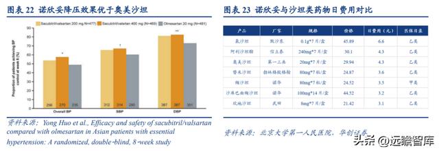 全球首个ARNI药物是诺华的沙库巴曲缬沙坦钠片(诺欣妥)。诺欣妥由脑啡肽酶抑制剂(沙库巴曲)和ARB(缬沙坦)按摩尔比1:1组成共晶体,是心血管领域首个双活性物质的共晶体。在治疗高血压方面,诺欣妥在中国III期临床数据显示,治疗8周后,沙库巴曲缬沙坦的降压效果显著优于目前降压效果最好的奥美沙坦,同时还具备靶器官保护和改善代谢紊乱的作用。
