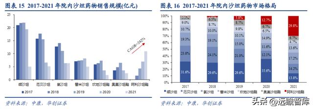 根据中康数据,阿利沙坦酯是2021年唯一实现增长的沙坦药物,院内市占率首次超过缬沙坦,成为中国最大的ARB品种。