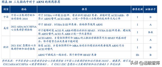 ARNI现成为心衰治疗一线用药。《中国心力衰竭诊断和治疗指南(2018)》推荐耐受ACEI/ARB的射血分数减少的慢性心衰(HFrEF)患者使用ARNI替代ACEI/ARB(I,B);美国ACC/AHA/HFSA在2022年最新心衰治疗指南中建议使用ARNI来降低HFrEF病发率和死亡率(I,A),并且可耐受ACEI/ARB的慢性HFrEF患者利用ARNI进行替代(I,B-R);欧洲《ESC急性和慢性心力衰竭的诊断和治疗(2021)》也建议HFrEF患者使用ARNI替代AECI以降低心衰住院和死亡风险(I,B)。从中国、美国和欧洲最新的心衰治疗指南可以看出,ARNI具有较高的临床用药地位。