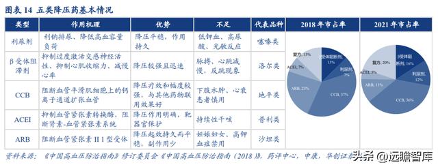 高血压治疗用药主要包括利尿剂、β受体阻滞剂、钙离子通道阻滞剂(CCB)、血管紧张素转化酶抑制剂(ACEI)、血管紧张素II受体拮抗剂(ARB)及组成的单片复方等。2018年CCB和ARB为降压药两大主要品种,市占率分别为37%和23%,2021年CCB市占率36%。在药品集采后,ARB主要品类均被纳入集采,市场规模减少,导致2021年ARB市占率下降至11%。