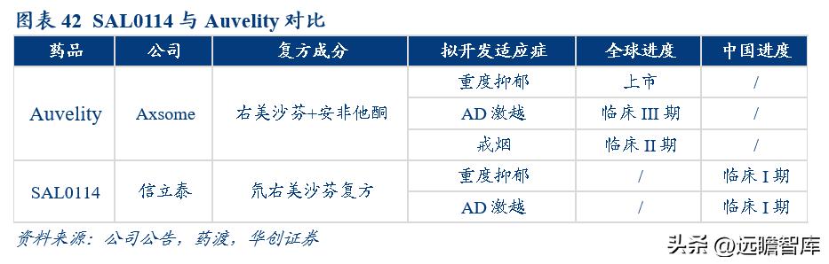SAL0114为氘右美沙芬复方,根据公司2022年11月14日公示的临床试验信息显示(登记号:CTR20222884),我们推断SAL0114可能为氘右美沙芬和安非他酮的复方。国内目前尚无同类药物布局,SAL0114作为Auvelity潜在me-better新药,有望满足中国庞大的抑郁及AD激越患者需求。