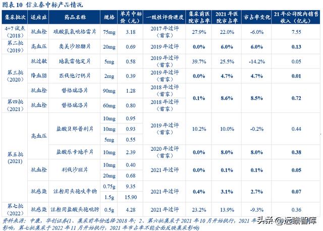 在六轮国家药品集采中(不包括胰岛素专项),除了氯吡格雷外,公司还先后中标了奥美沙坦、地氯雷他定、替格瑞洛等9个品种。其中奥美沙坦、匹伐他汀等均为公司新获批的光脚品种,而新品种进入集采能帮助公司实现市场的快速拓展。