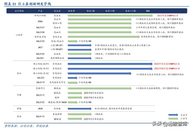 公司创新药管线围绕慢病用药领域已形成短、中、长期布局,产品研发进度有序推进,小分子、大分子兼备。