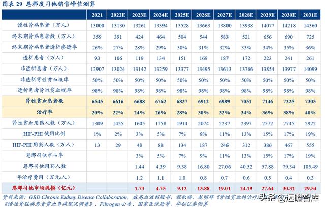 前文已提及公司已上市的信立坦在肾内科的应用,2019年公司联合多家医院在肾内科启动“阿利沙坦酯CKD临床研究”,公司在肾科拥有一定专家和渠道资源。恩那度司他与信立坦在推广科室、专家资源和目标患者具有协同效应,上市后推广放量将更加顺利。目前,公司已开始组建恩那度司他销售队伍,准备前期上市推广。如果恩那度司他获批后能够进入医保目录,也将为恩那度司他带来较大业绩弹性。通过测算,我们认为恩那度司他销售峰值将达到30亿元。