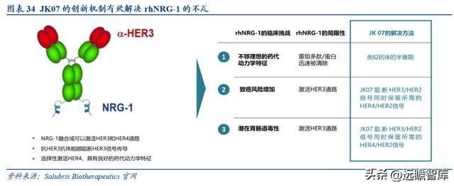 相比于rhNRG-1,JK07融合了NRG-1片段和抗HER3抗体两个蛋白片段,既降低了患癌风险和胃肠道毒性,同时也解决了NRG-1半衰期短的问题。通过独特的分子设计,解决了rhNRG-1蛋白疗法的局限性,提高成药性和安全性。