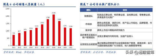 公司推广团队可分为销售团队、市场部、医学部、政府事务(PA)及医院大客户管理(KA)团队、运营部及合规管理。其中,销售团队涵盖血压事业部、特药事业部、血栓事业部、零售事业部等,多渠道多元化进行推广。市场部拥有业务拓展、调研分析、新产品上市规划、品牌管理、市场项目运营等多支团队。医学部具有上市后IV期临床研究能力。