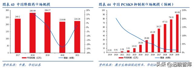 受他汀类药物集采影响,2020年和2021年中国降脂药市场规模分别为219和224亿元,较2019年分别下降23%和21%。中国PCSK9抑制剂市场起步较晚,依洛尤单抗(安进)和阿利西尤单抗(赛诺菲)分别于2018年和2019年在中国获批上市,是目前唯一上市的两款产品,国产信达生物已递交上市申请。
