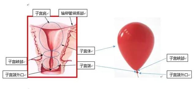 单从形状和结构上理解,形象的比喻就是,子宫颈相当于气球柄,子宫体相当于气球体,子宫峡部就相当于气球柄和气球体连接的部分。当然,子宫颈和子宫体的比例,与气球柄与气球体的比例大不相同。