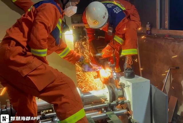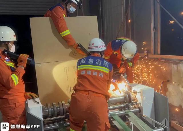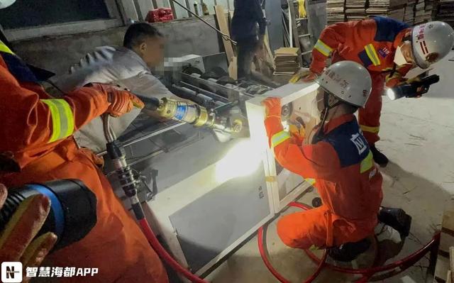 了解情况后,消防救援人员决定利用无齿锯对液压切纸机滚动轴部分进行切割拆除,并在切割过程中不断对切割部位进行浇水降温。
