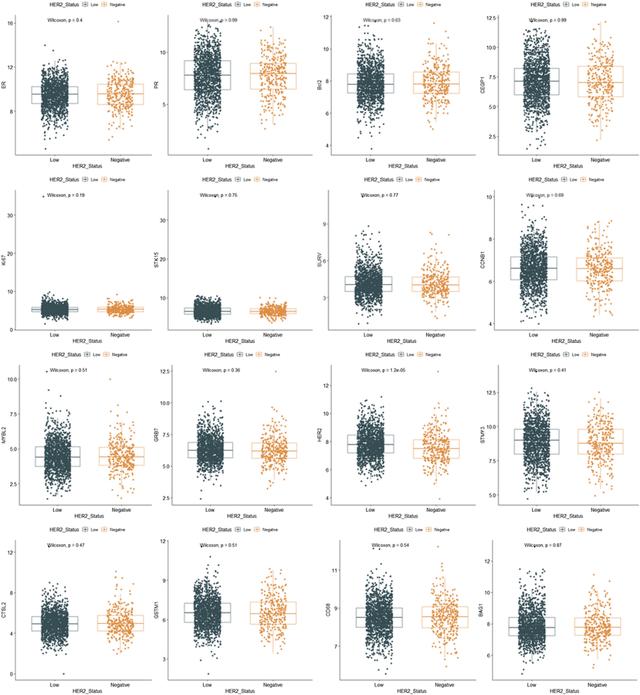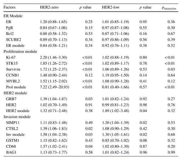 并且,交互检验结果显示,大多数增殖相关基因与HER2状态存在显著相关性。在经AJCC T分期和N分期校正的多变量分析中也发现了类似结果。而HER2相关基因(或侵袭相关基因)与HER2状态的相关性并不显著。