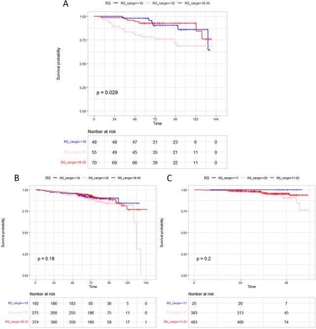 图3. 不同RS患者的DFS。A:2015年12月前诊断的HER2-0队列,B:2015年12月前诊断的HER2-low队列,C:2016年1月后诊断的HER2-low队列