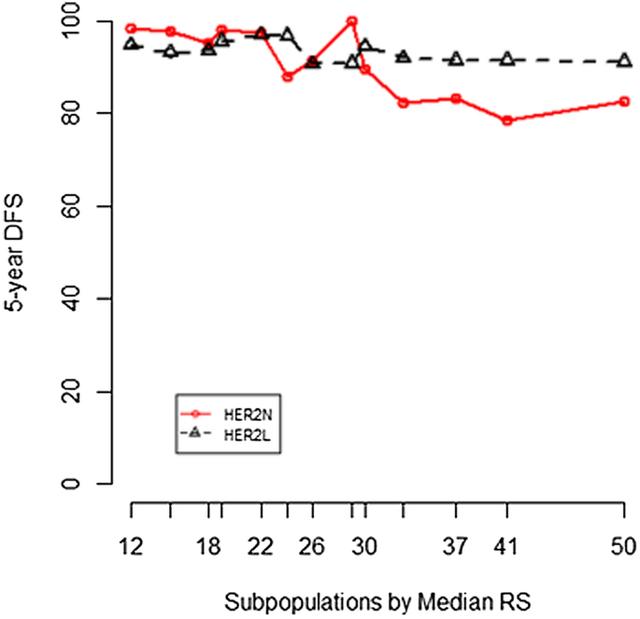 图4. 根据中位RS,不同HER2状态患者的5年DFS