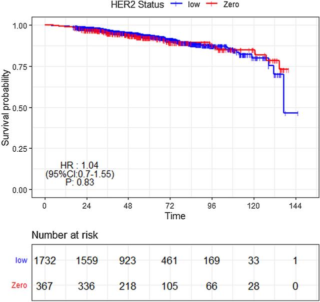 生存分析显示HER2-low和HER2-0患者之间无明显差异。尽管先前的研究表明HER2的适度表达可能是一个不利的预后因素,但本研究显示,在HR阳性患者中,HER2状态(low/0)不是一个独立的预后因素。最近的两项研究也发现HER2-low和HER2-0的HR阳性乳腺癌患者的生存结局相似。此外,一项研究表明,与HER2-low相比,HR及其相关基因可能是HER2-low/HR阳性乳腺癌的主要肿瘤学驱动因素。