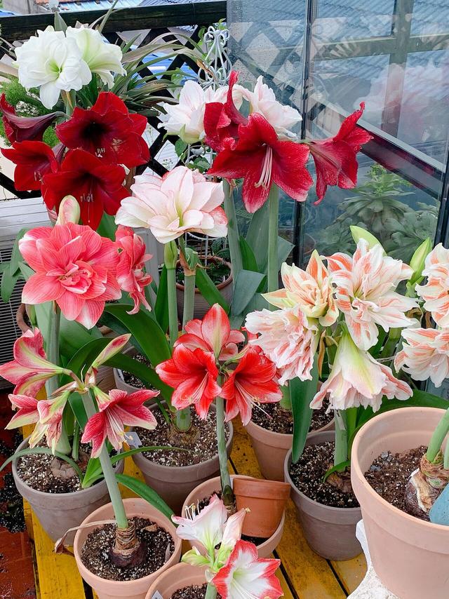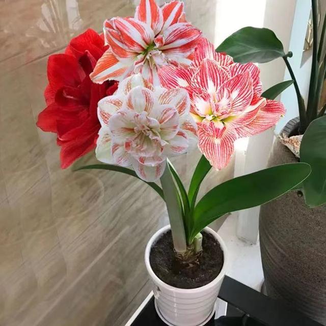 朱顶红好看又好养,将它养护在大盆里面,一两年就会生出很多的小球,移栽到地里也会长成一大丛。到时就可以将它挖出来栽到花盆里了,一两年的时间就可以开花,放到有暖气的地方过年正好开花。但是,冬天要经过低温的春化才可以开花,姹紫嫣红各种颜色的朱顶红,开成一片大花海,像牡丹,像玫瑰,漂亮无限。