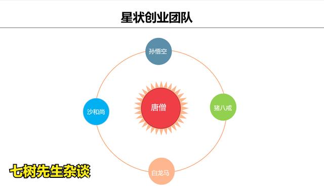 星状创业团队只指团队中有一个核心人物,充当领队角色。一般在团队形成前核心人物已经具备了创业的想法,其他团队成员主要扮演支持者角色。