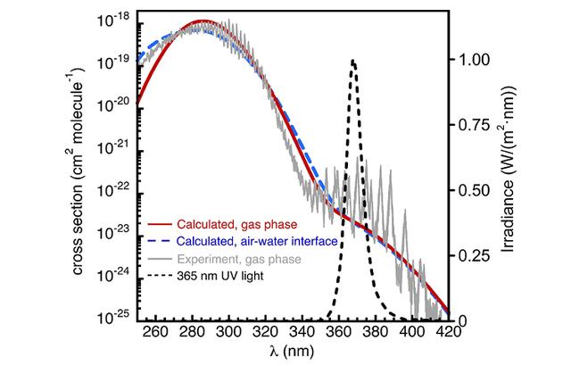 这些反应可以通过两个不同的初始步骤发生:直接激发到三线态(对应波长340-400 nm)或先激发到单线态然后通过系间窜越来到三线态(对应波长290-340 nm)。计算得出的二氧化硫在空气-水界面处的吸收光谱(图3)的特征与计算的气相吸收光谱相似,这表明二氧化硫与水的相互作用不会极大地改变其吸光特性,空气-水界面提供了一个富含水分子的环境。由于太阳光中UVA的成分要远大于UVB和UVC的成分,因此,在之前的研究中经常被忽视的波长340-400 nm的紫外光所引发的光化学将有助于解释在雾霾中观测到的硫酸根浓度和模拟值之间存在的巨大差距。这项工作发现了大气中雾霾的隐藏成因,并开启了大气中自旋禁阻光化学研究的新篇章。