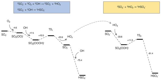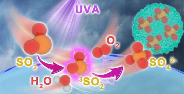 在过去几年里,对新的大气二氧化硫氧化成硫酸根机制的探索仍在继续。硫酸根的形成过去被认为主要是均相反应,然而,为了平衡模型中和观测到的硫酸根质量的差异,二氧化硫多相氧化的重要性已逐渐被意识到,二氧化硫的氧化需要某些氧化性物质(如二氧化氮)和催化性物质(如过渡金属离子或黑碳)。二氧化硫的光化学在大气中也十分重要,一般来说,单线态基态的二氧化硫吸收紫外光后将首先被激发到激发单线态,然后发生快速的系间窜越产生寿命较长的三线态,三线态二氧化硫在气液界面处会与水分子进一步反应产生羟基自由基和HOSO,强酸性的HOSO有助于酸雨的形成,而羟基自由基会进一步氧化二氧化硫生成硫酸根。