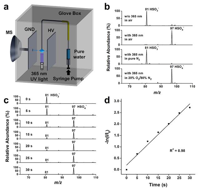 气液界面具有特殊性,很多气液界面处的化学反应与体相溶液中的化学反应截然不同,然而很少有技术能够只对几纳米至几十纳米厚的气液界面层进行研究而不受到体相溶液的干扰。张新星研究团队长期从事气液界面质谱学研究,所开发的场致液滴电离-质谱(FIDI-MS)技术具有极高的气液界面选择性,可以只对薄薄的气液界面层进行实时原位采样而不受到体相溶液的干扰。在本研究中,通过使用独特的FIDI-MS技术,该团队通过对气液界面所处环境的气体氛围的精确控制,研究了UVA引发的二氧化硫在气液界面处的光氧化化学。