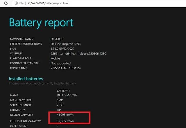 上述命令将以 HTML 格式保存电池健康报告,并且可以在任何浏览器中打开。如果完全充电容量与其设计容量(以 mWh 为单位)相比极低,则该更换电池了。该报告还可能指出任何物理损坏的迹象。