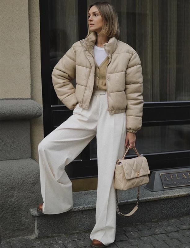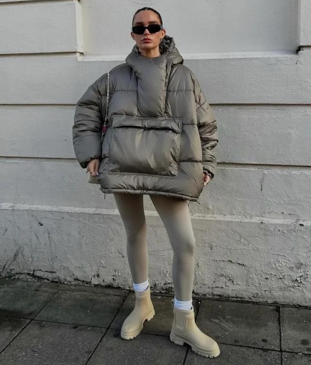 注意:体量越大的衣服越容易带给人们一种厚实感,所以这里讲述的上身厚和下身薄的穿法并不是小部分女性所理解的「上身穿棉服、下身穿短裤」。