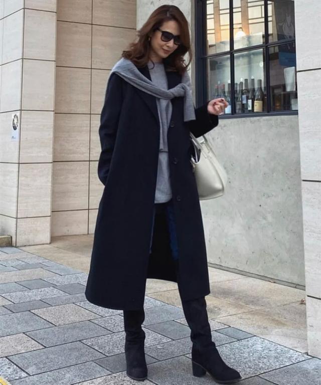 再配上一条紧紧贴合腿部线条的黑色纯棉长裤,毛呢比纯棉更加厚实有筋骨感,所以上厚下薄的高阶穿衣法则就这么跃然于眼前,不动声色奏响冬日高贵优雅的低奢大戏。