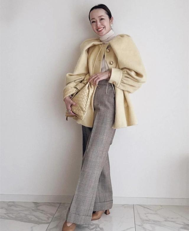 上图这套时尚look:淡黄色短款毛呢大衣,衣领和袖管部位有着褶皱和灯笼状的设计点缀,将观赏者的视线牢牢固定在上半身。