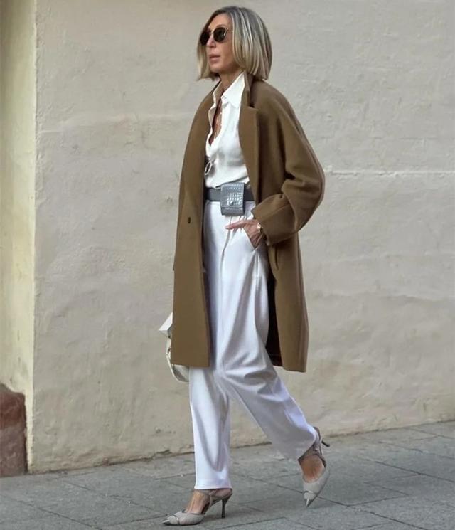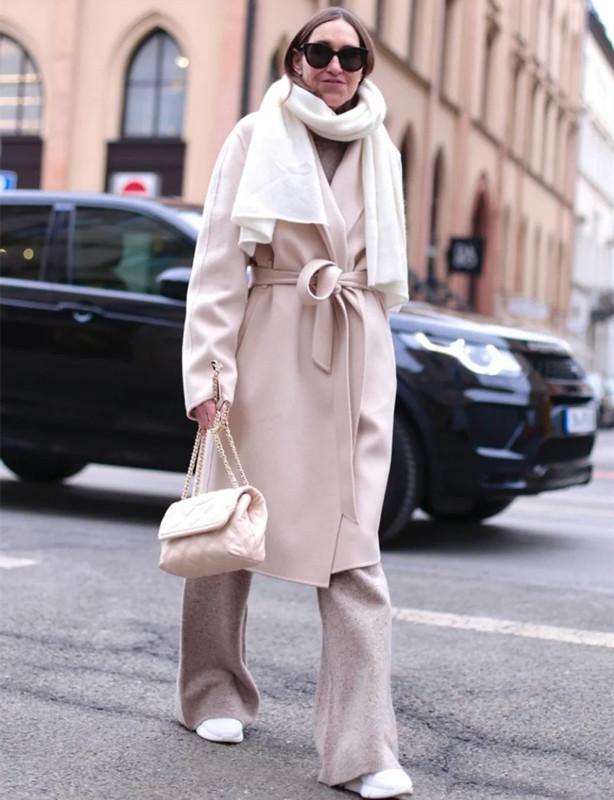 沙色毛呢大衣+燕麦色纯棉拖地裤。整体造型遵循上身厚,下身薄的穿搭模板,没有出现任何拉宽体型或是显臃肿的情况。同时上下半身的颜色皆是充满高雅氛围的色调,素雅沉静又不失成熟女人应有的文艺调性,邻近色所展现出来的色彩差异又让整体摆脱同色系的单调和枯燥,别有一番风情在其中萦绕。