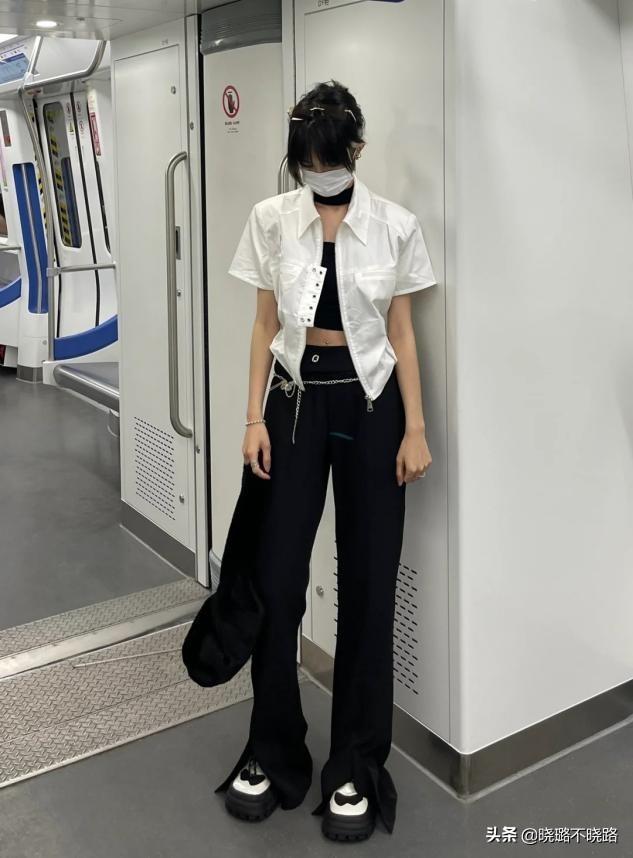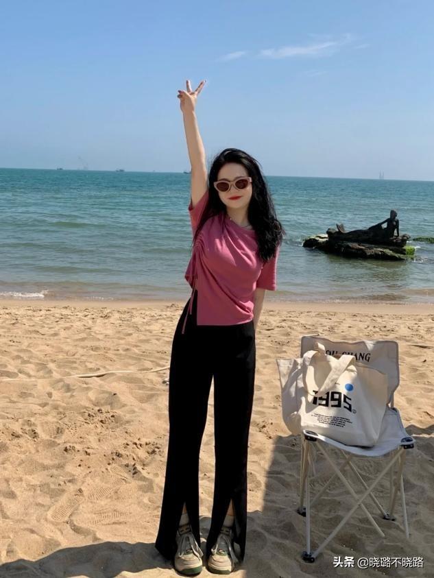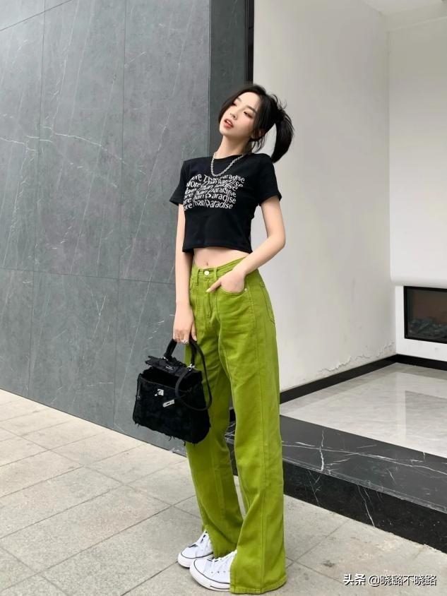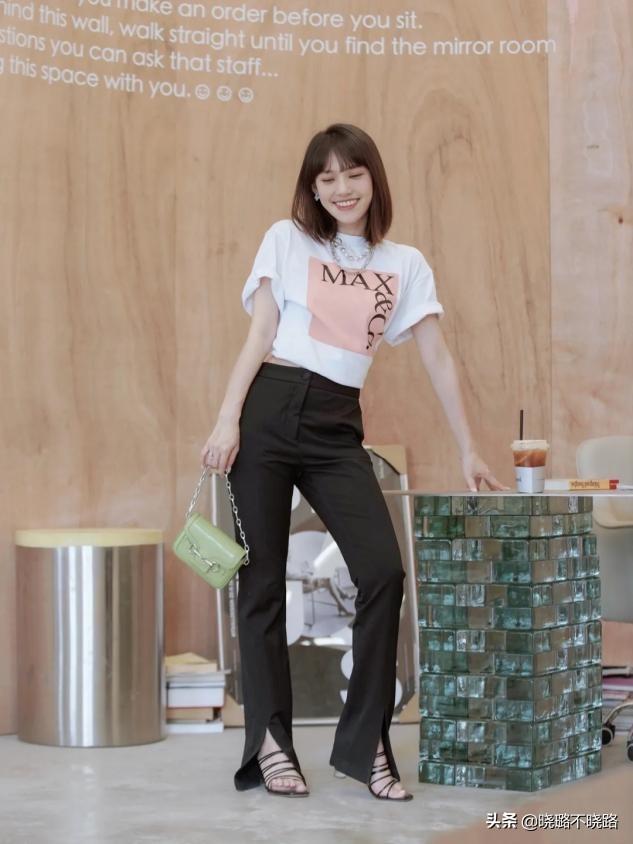 鲜艳的开衩裤怎么搭?上衣颜色收敛点不会错。最包容的黑色印花T恤结合一点露腰效果,又辣又显贵。