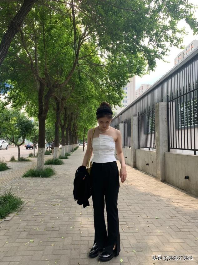 黑色禁欲系裤子搭配性感抹胸上衣不容易显得风尘,大概是因为黑色的内敛神秘吧!抹胸上衣可选低饱和度的白色卡其色,也可以选择鲜艳的红橙黄绿,抓马也不怕翻车。上身不胖的话还可以尝试鱼骨上衣。