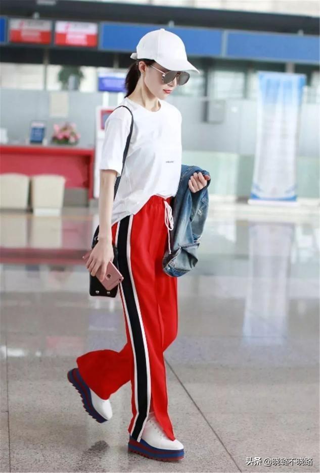 用白色纯净的T恤搭配校服款开衩裤可太潮了,侧边条纹很显著,很有活力,上衣颜色尽可能纯净能够突出重点。